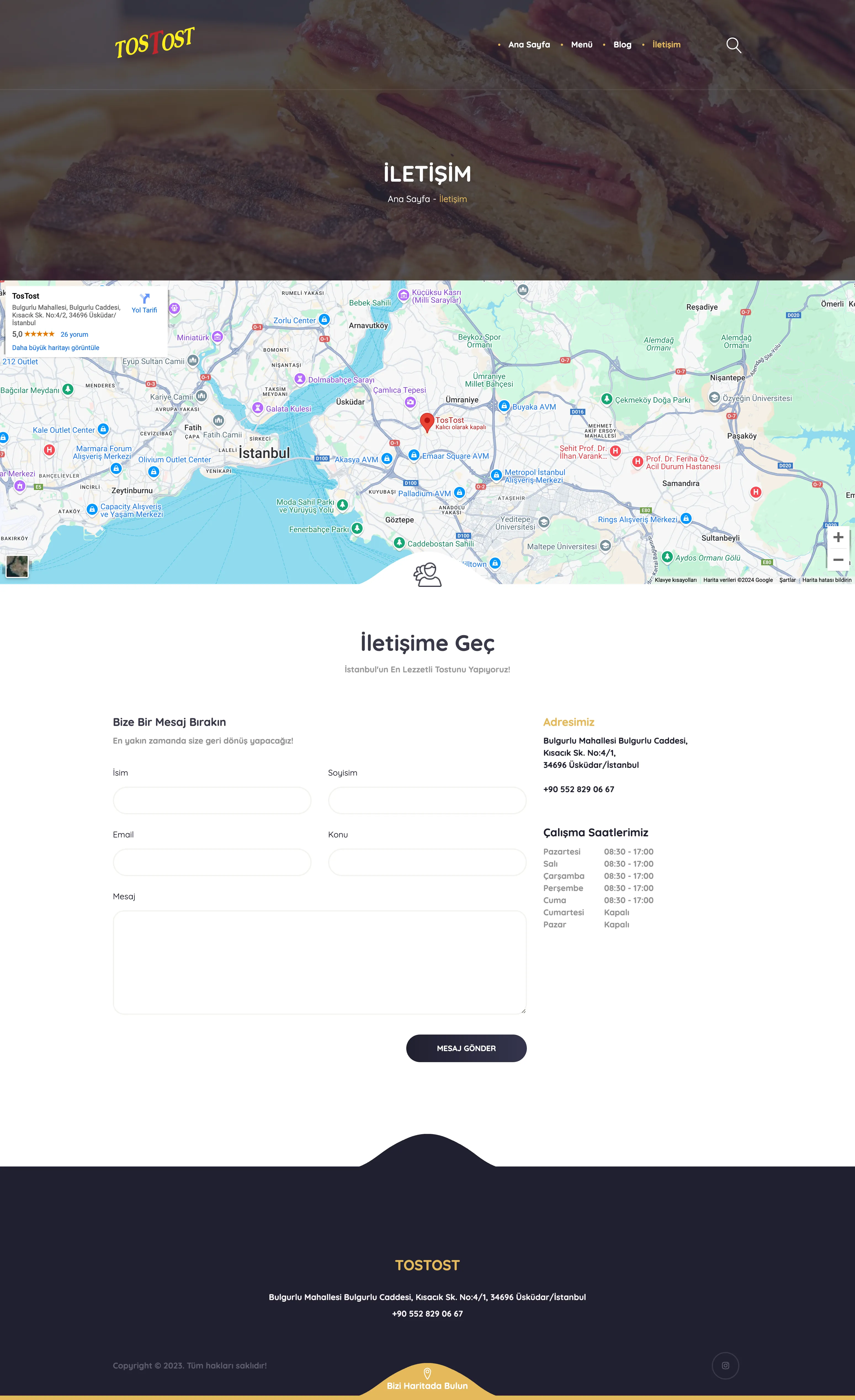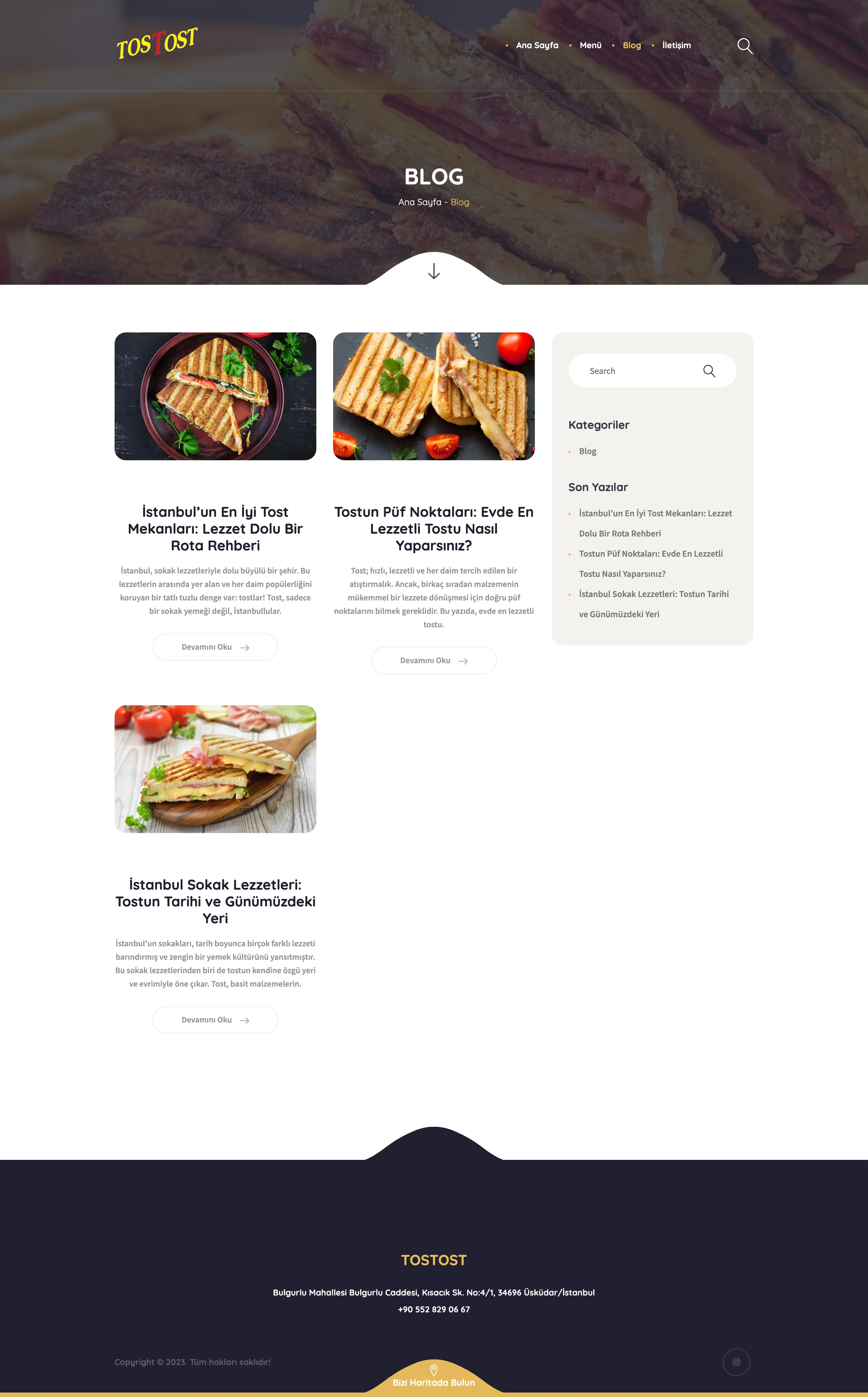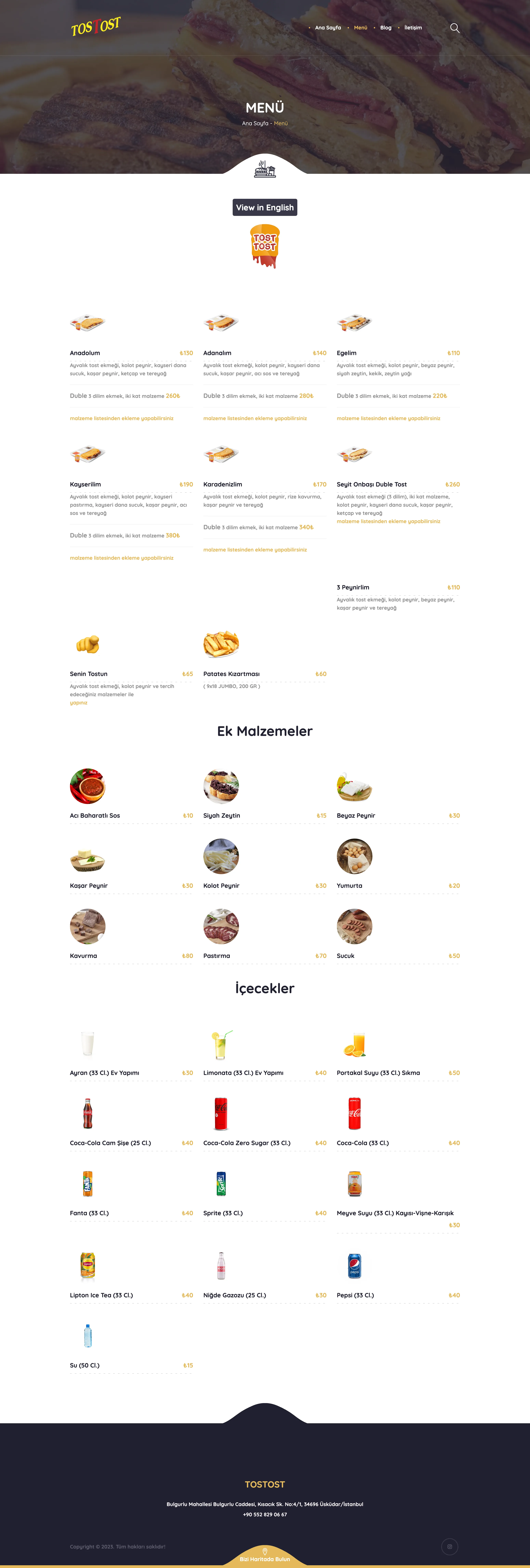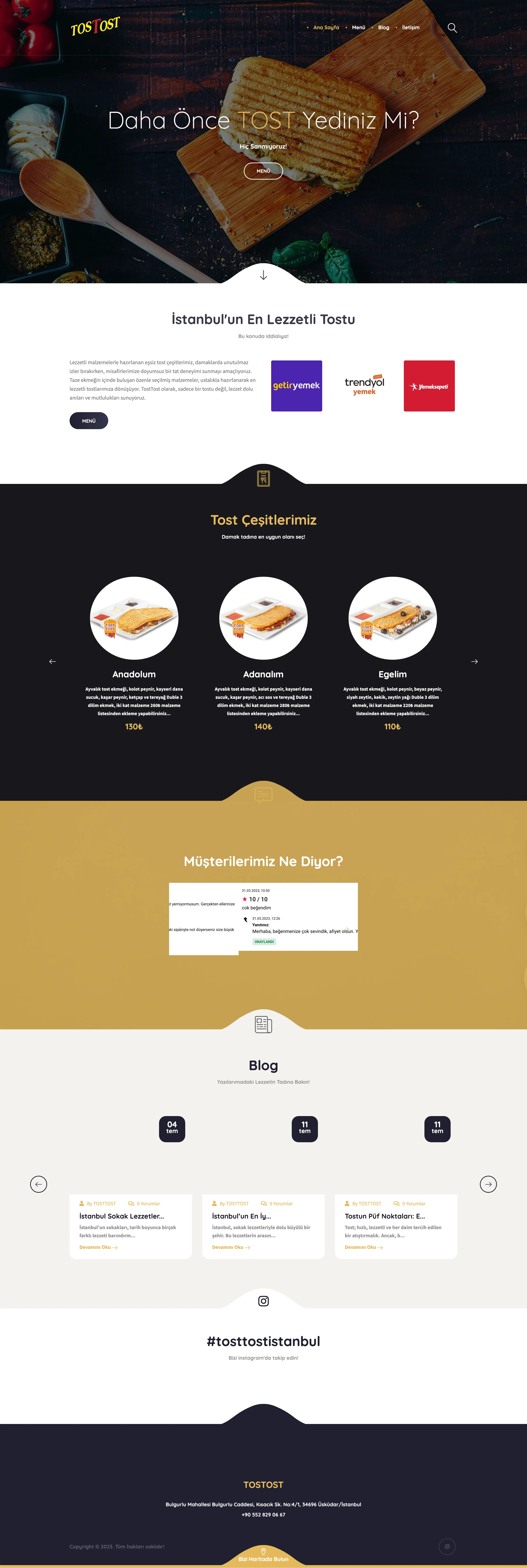 Tostost için modern, estetik ve kullanıcı dostu bir web sitesi tasarladım. Web sitesi, tostların lezzetini yansıtmak, ziyaretçilere kolay gezinme ve hızlı bilgi erişimi sağlamak amacıyla kolay yönetilebilir şekilde oluşturuldu.